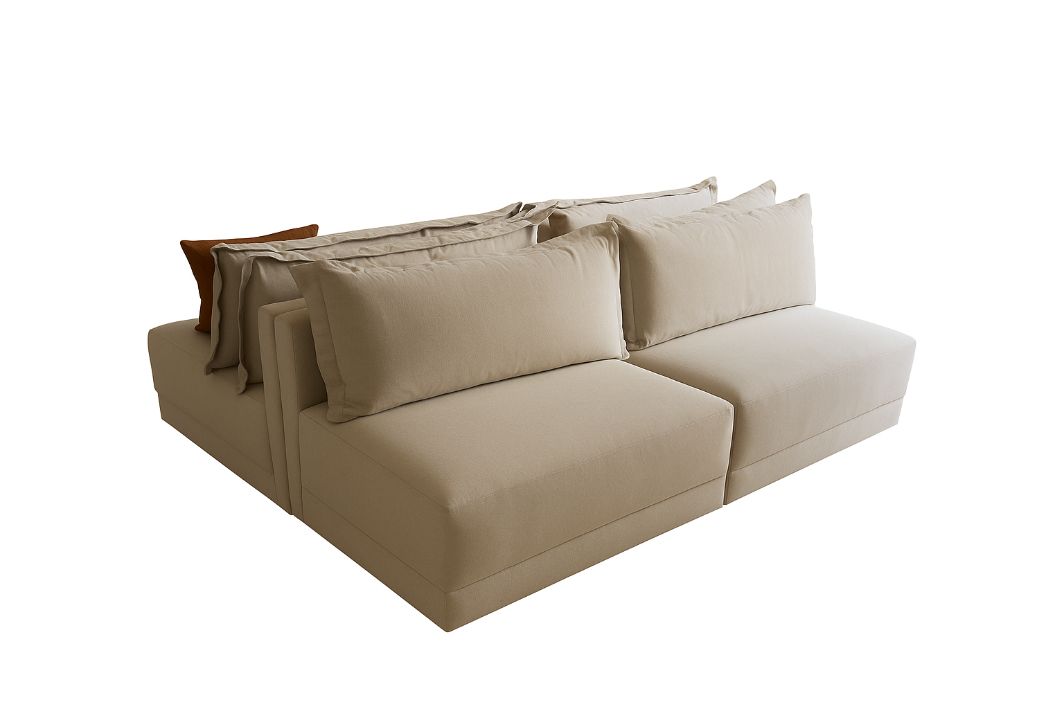 Sofá ilha modular contemporâneo, estofado em tecido de alta qualidade, com design clean e minimalista. Possui assentos amplos, encostos duplos com almofadas volumosas e confortáveis, permitindo acomodar pessoas em ambos os lados. Ideal para ambientes integrados, oferece versatilidade, conforto e elegância, sendo perfeito para áreas de convivência modernas.